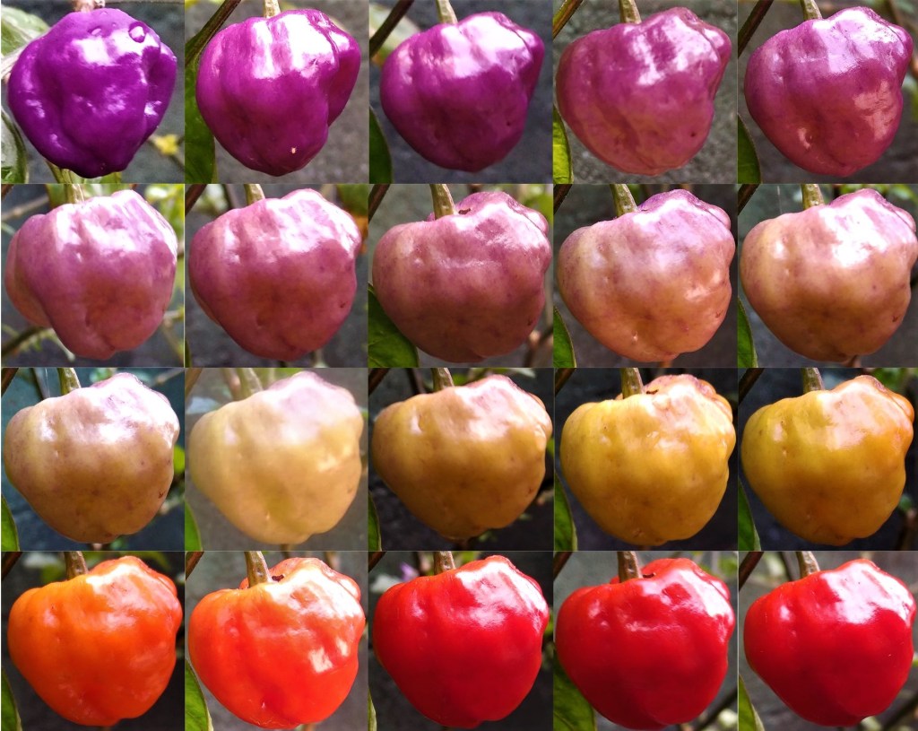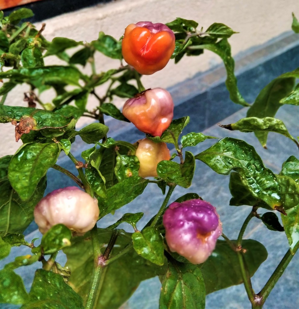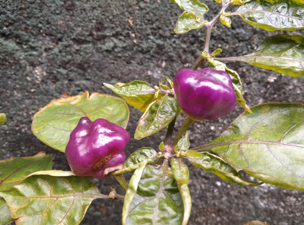 Although I don’t know the exact name of the breed, this chili pepper is a purple variety of “nai miris” (Capsicum fruescens) and it has to be an ornamental hybrid pepper breed (given their awesome colors) as opposed to its green “nai miris” counterparts. When the pods mature, the shift in colors from bright beautiful purple to pink to white to yellow to orange to an unbelievable bright crimson to ultimately bright scarlet was delightful. Imagine all of these colors displayed simultaneously in one plant and it’s nothing short of a vista from a fairytale. The pepper did actually taste hot (much like the green nai miris) and I used my first harvest to make garlic-pepper bread which tasted awesome.