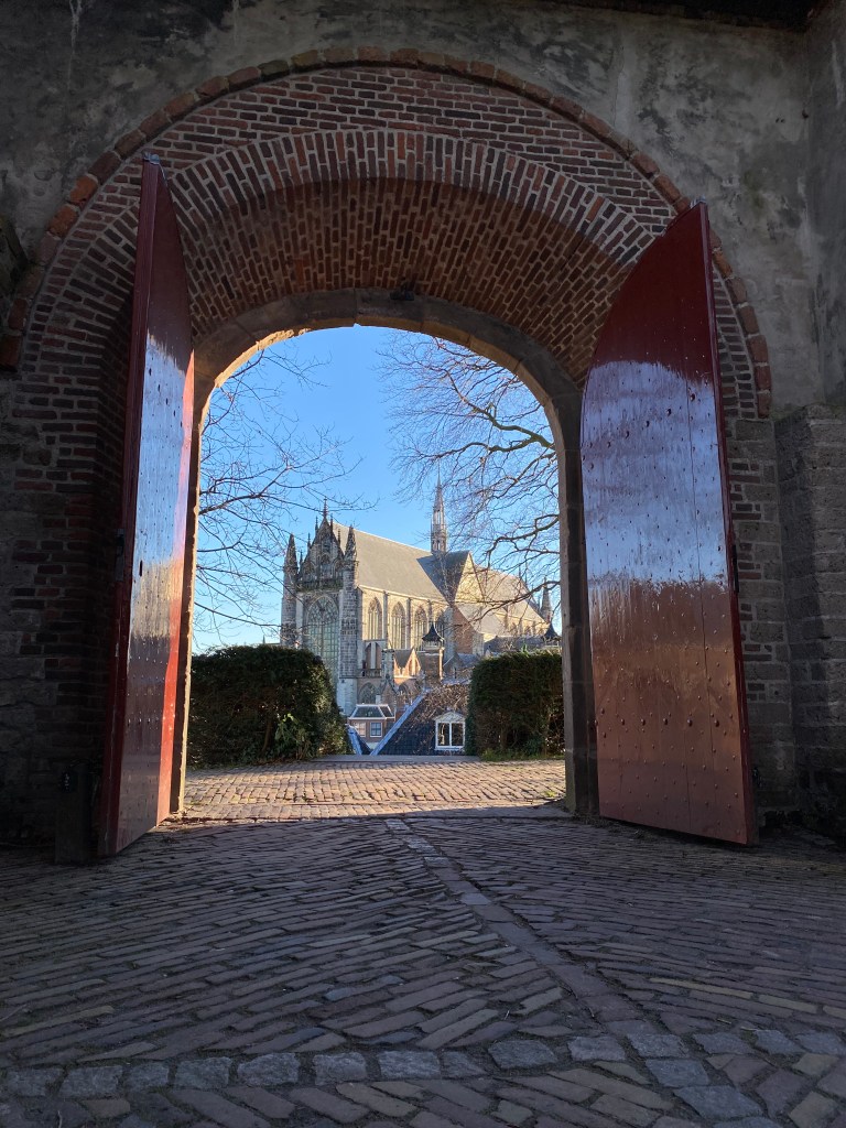 The doors of the Leiden Citadel opening to a breathtaking view of the oldest church (Pieterskerk Church) of Leiden, Netherlands.