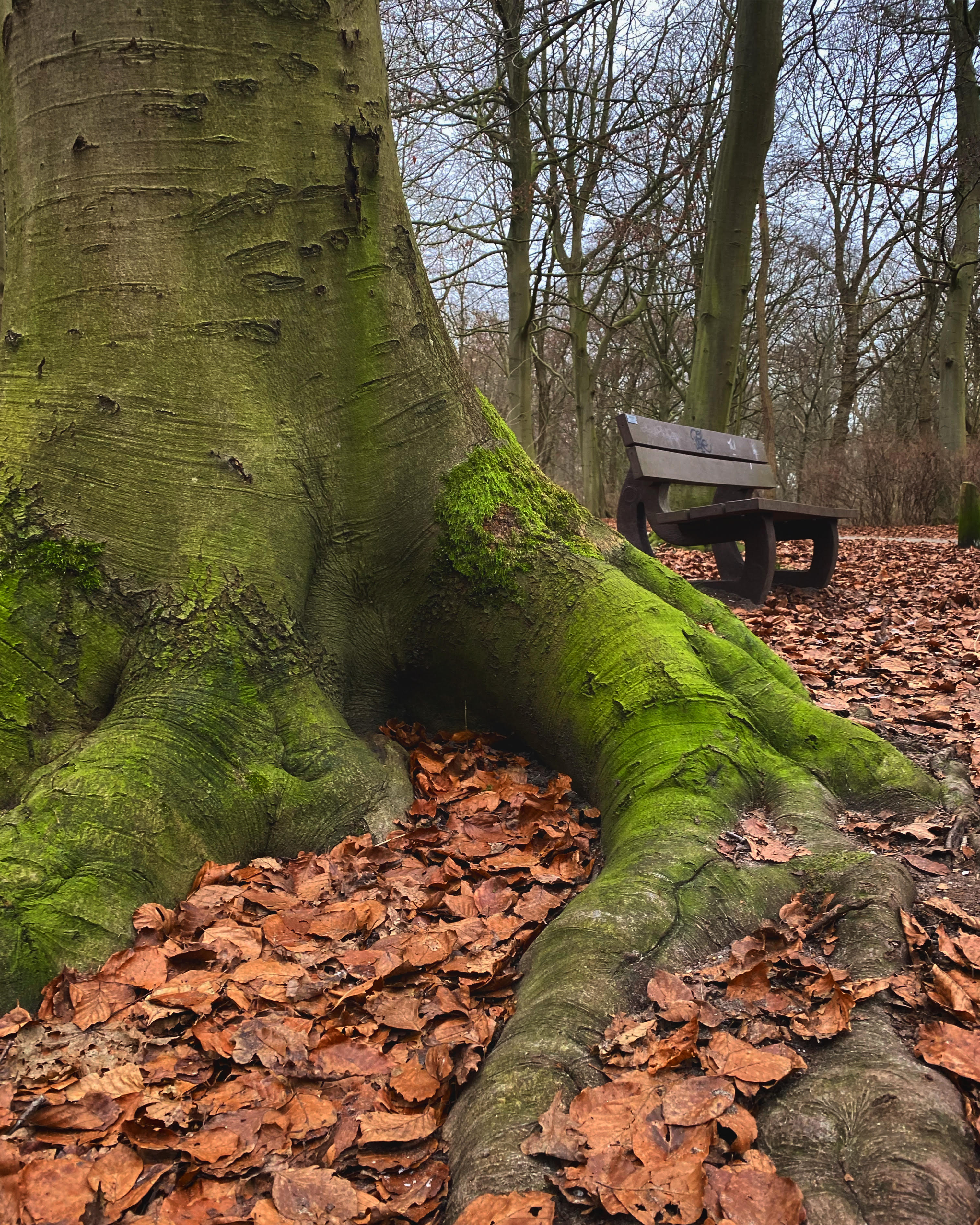 A view inside the “Scheveningse Woods”, a forest park in Den Haag, Netherlands appearing woody and naked, with its attire strewn across the forest floor.